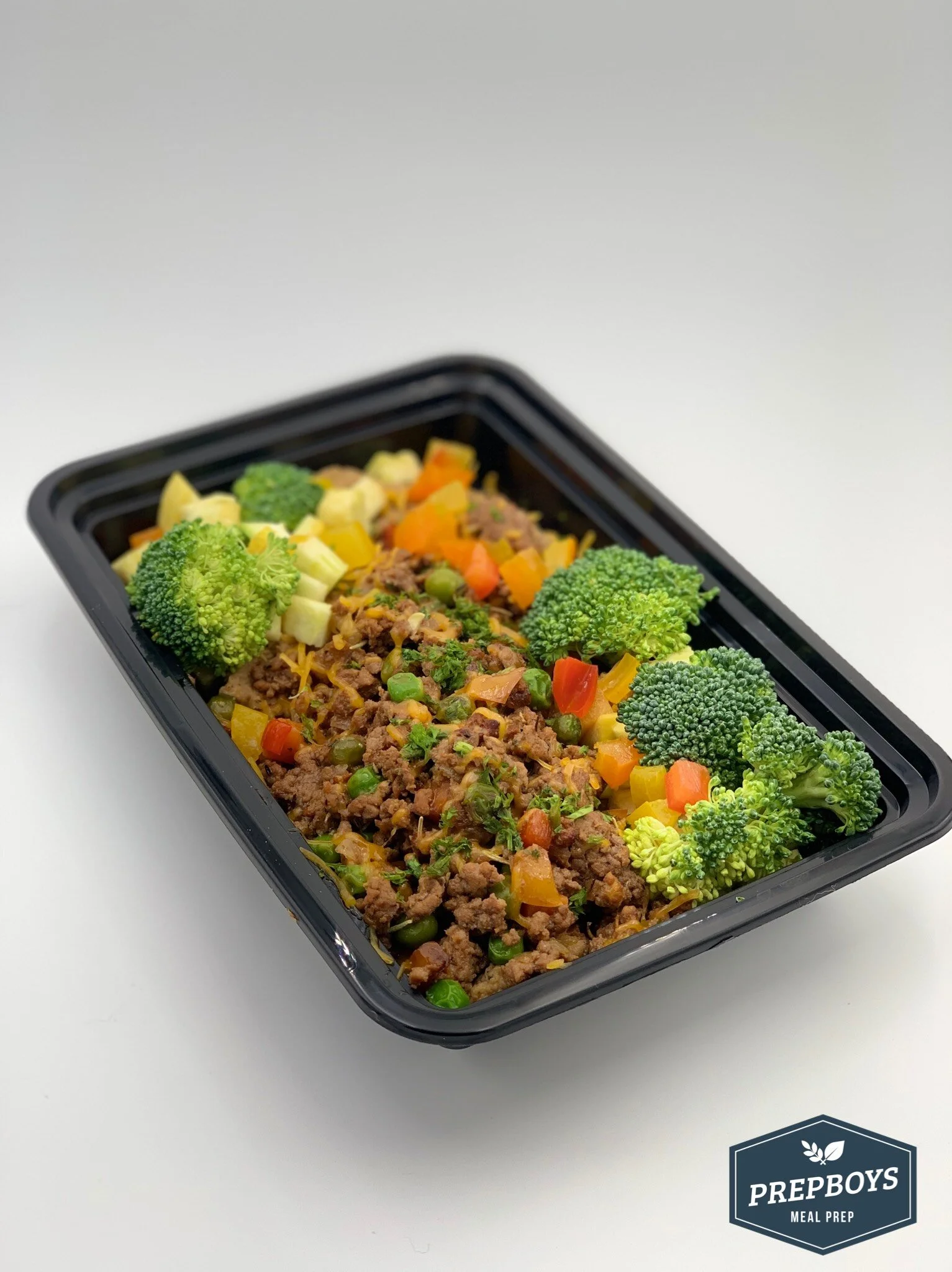 Ingredients: lean ground beef 80/20, tomato paste, herb mixture, garlic, onion, cheddar cheese, cauliflower, olive oil, bell pepper medley, peas, carrots, potato, heavy cream